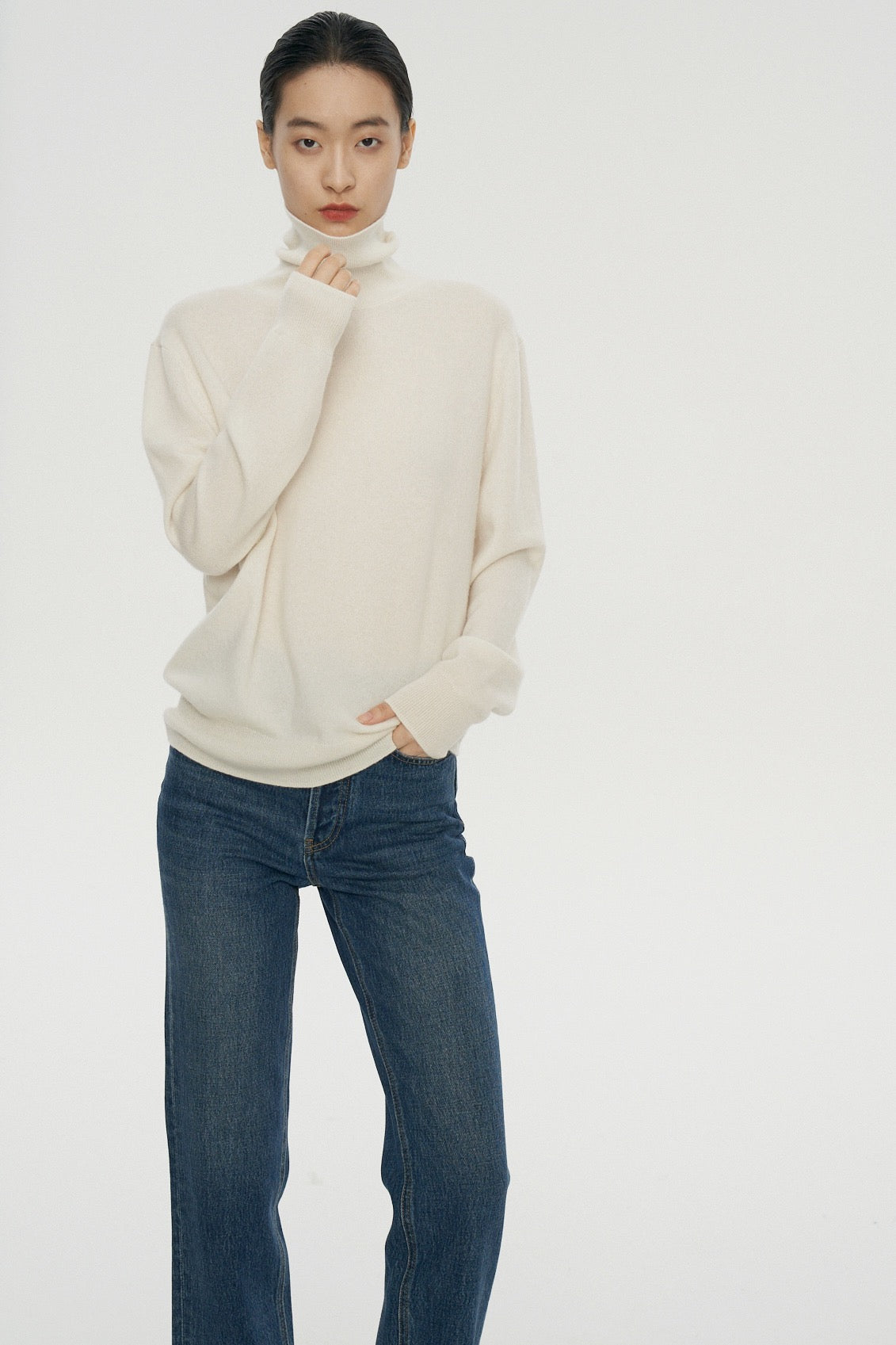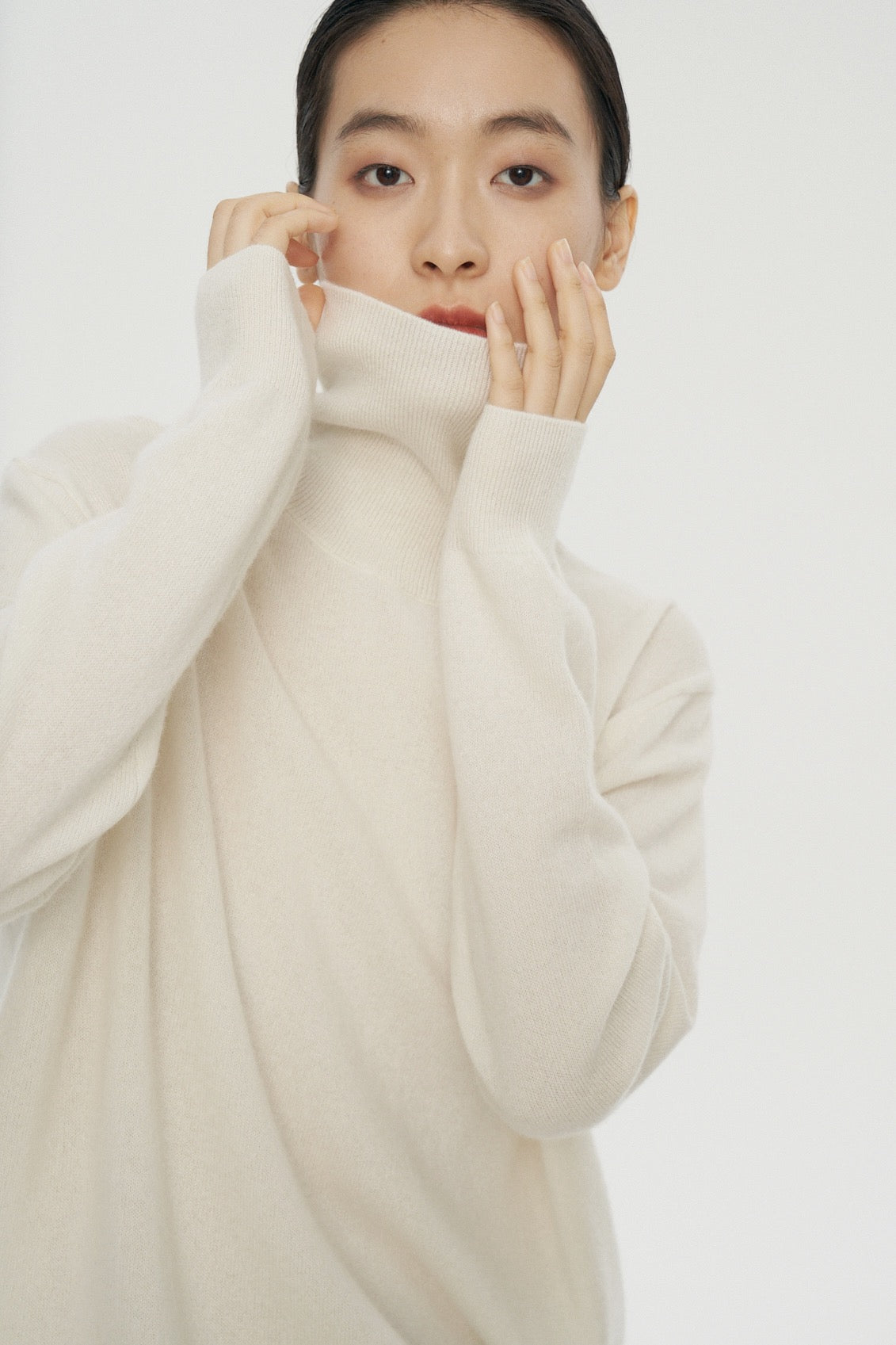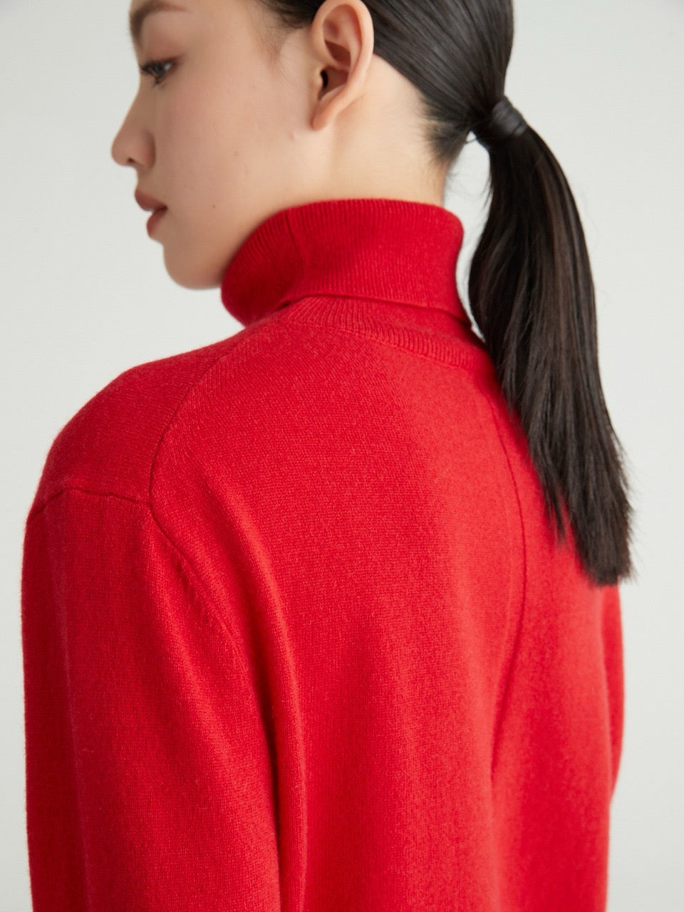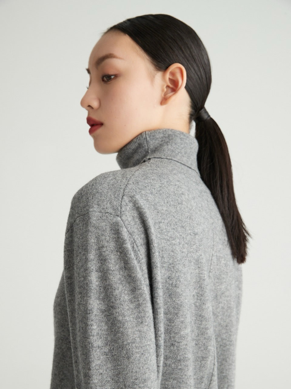 Its silhouette is clean and fluid, gently skimming the body without clinging. The high neckline frames the face with quiet sophistication, while the finely milled yarn offers natural insulation without bulk. Thoughtful details—like fully fashioned seams, a smooth handfeel, and subtle rib finishes—make this piece as elegant as it is wearable.